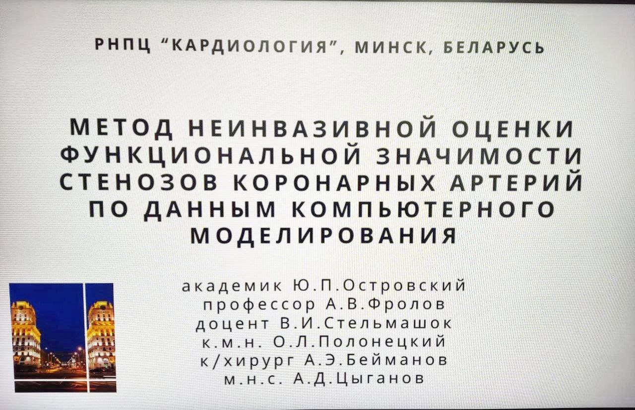 На секционном заседании «Функциональная и лучевая диагностика в определении показаний и оценке возможностей хирургического лечения ИБС» доклад «Неинвазивная оценка функциональной значимости стенозов коронарных артерий по данным компьютерного моделирования» представил заведующий лабораторией медицинских информационных технологий РНПЦ «Кардиология», д.б.н., профессор Александр Фролов.