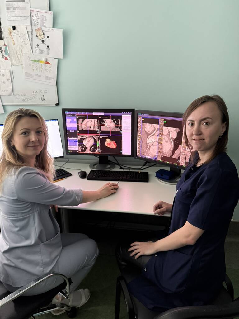 Стажировка «КТ-коронарография» – Анастасия Ефимова и Анна Модель, врачи-рентгенологи кабинета рентгенокомпьютерной диагностики рентгеновского отделения.
