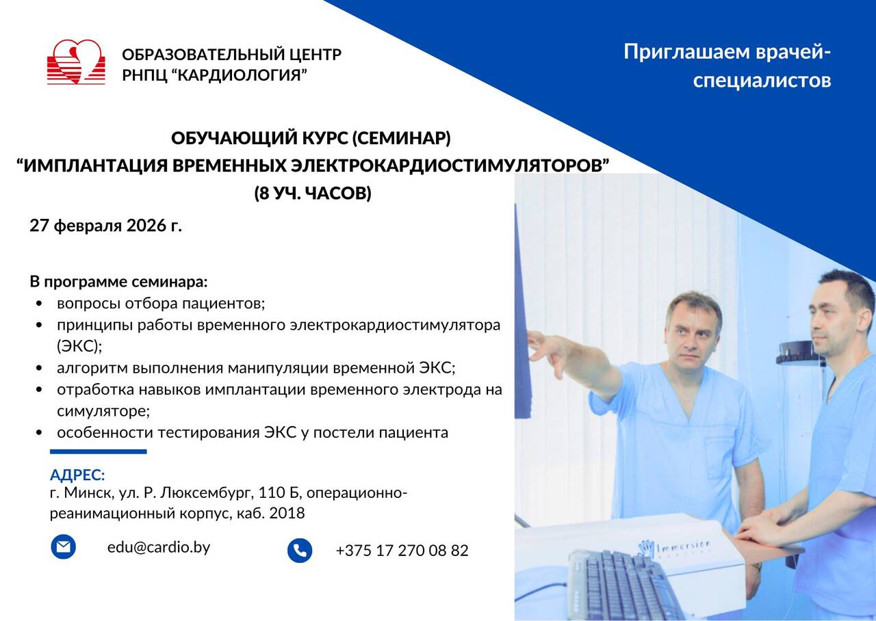 Образовательный центр РНПЦ «Кардиология» приглашает врачей-кардиологов, врачей-кардиохирургов, врачей-рентгеноэндоваскулярных хирургов, врачей-рентгенологов, врачей ультразвуковой и функциональной диагностики пройти стажировку на рабочем месте.